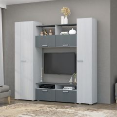 - Гостиная включает себя платяной шкаф, нишу под ТВ и пенал с полками