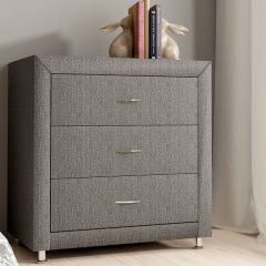 Элегантный комод отличается стильным дизайном и повышенным удобством. Три выдвижных ящика оснащены надёжными направляющими, обеспечивающими лёгкое открытие. Фасад ящиков и стенки комода покрыты обивочным материалом. Для удобства использования и продления срока эксплуатации, рекомендуется использовать стеклянную накладку. Накладка используется в качестве столешницы для комода и защищает его от повреждений и загрязнений.